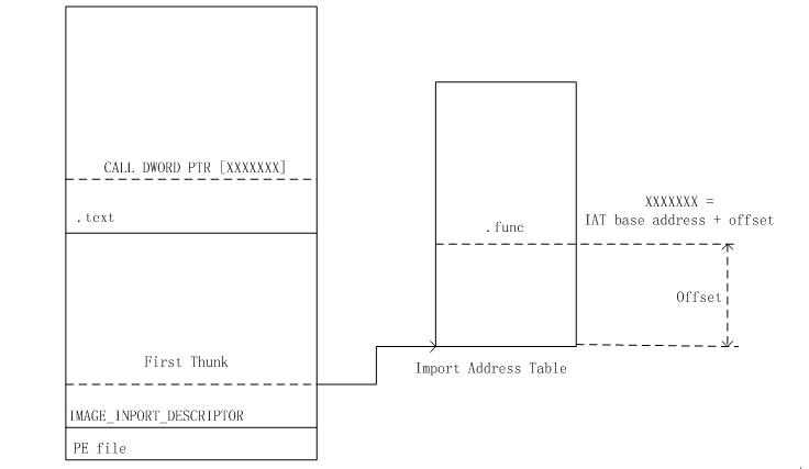 其中[XXXXXXXX]表示.func函数在IAT中相应slot的地址,如下图所示,XXXXXXXX值是由IAT表的加载地址和.func的slot index两者相加得到的: