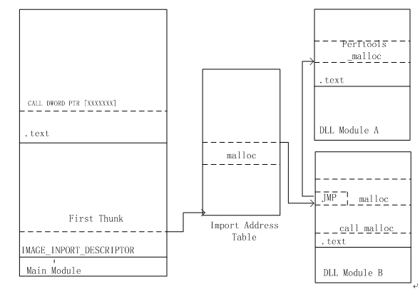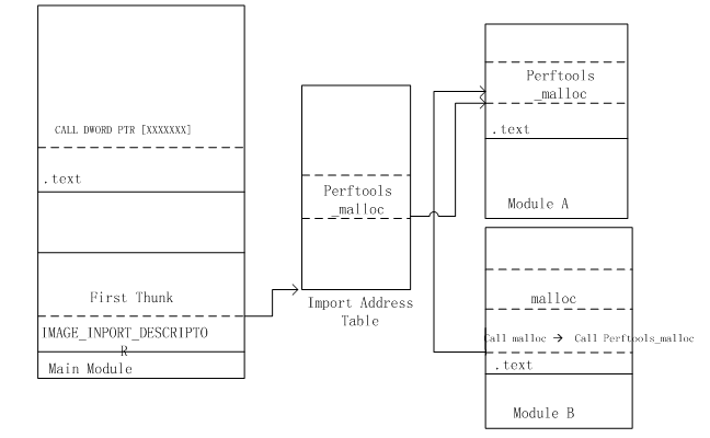 图A,main module是可执行文件,module B是底层运行库或者实现了内存管理的第三方库,module A是tcmalloc,tcmalloc需要拦截所有module的IAT表中原来调用module B中malloc的slot,同时还要拦截所有module B中本地调用malloc的call指令,将他们都拦截到tcmalloc中相应的替换函数。