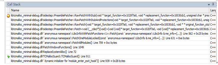 tcmalloc究竟是在何时对函数进行了拦截?一切还得从文章最开始所提到的两个配置讲起,使用tcmalloc时只需要在程序中添加两项配置:additional dependencies: libtcmalloc_minimal.dll; force symbol references:__tcmalloc; 其中第一项是配置任何DLL都所必需的步骤,而第二个选项是由于在实际工程里面不会显式调用tcmalloc模块内的函数,而导致编译器在编译优化阶段忽略整个tcmalloc模块,所以需要强制引入一个该模块内的符号,即__tcmalloc,告诉编译器tcmalloc是工程所依赖的模块,对于32位的系统只需要强制引入符号_tcmalloc即可。其实__tcmalloc在tcmalloc里面只是一个空函数,不起任何作用,那么哪里才是tcmalloc拦截的真正入口?那得从另一个类TCMallocGuard说起,在文件Tcmalloc.cc中定义了一个TCMallocGuard的静态对象module_enter_exit_hook