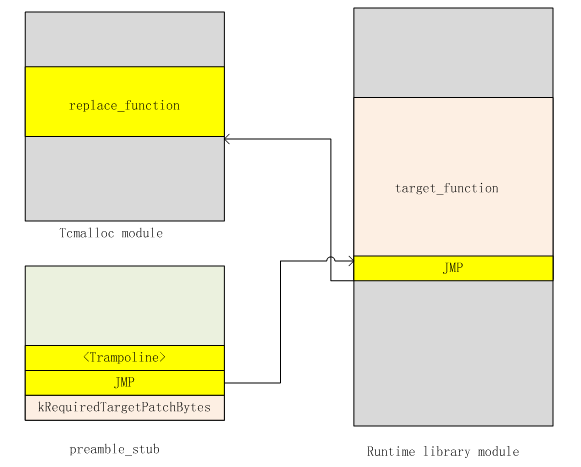 图中黄色部分表示tcmalloc所做的修改,preamble_stub最初的kRequiredStubJumpBytes字节内容是target_function最前面kRequiredStubJumpBytes字节内的指令经过相对地址重计算后的替代指令;kRequiredStubJumpBytes字节后面跟着一条JMP指令用来跳转到target_function中第(kRequiredStubJumpBytes + 1)byte地址空间;JMP指令后还跟着几条trampoline指令,用来处理preamble_stub和target_function的地址空间间隔超过4G的情况,这里不做过多介绍。target_function最前面kRequiredStubJumpBytes字节用一个JMP指令替代,跳转到tcmalloc的replacement_function的地址空间。从中可以看到preamble_stub的作用其实有两个:
