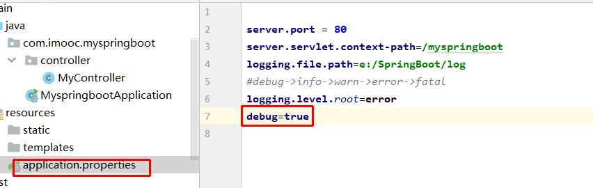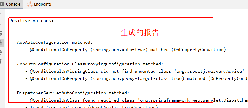 debug =true 后会自动的把日志打印级别调整为debug,会将程序的底层和执行的细节打印在日志中,并且在程序启动后还会生成一个报告,来告诉我们哪些组件加载了,哪些组件没有加载。