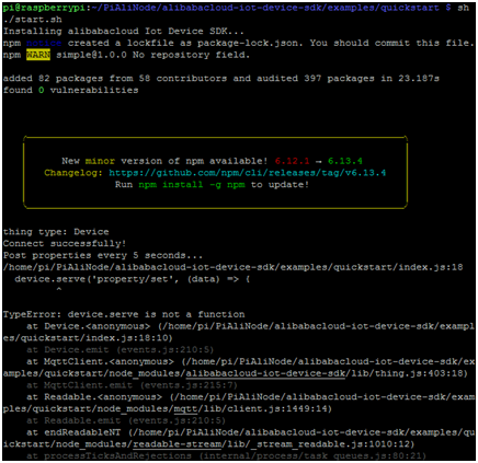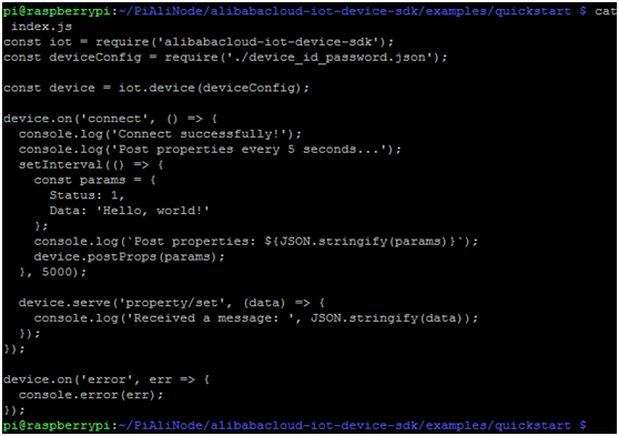 pi@raspberrypi:~/PiAliNode/alibabacloud-iot-device-sdk/examples/quickstart $ nano index.js