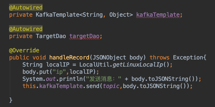 如上图所示,只需要调用kafkaTemplate对象就可以直接发送消息了。
