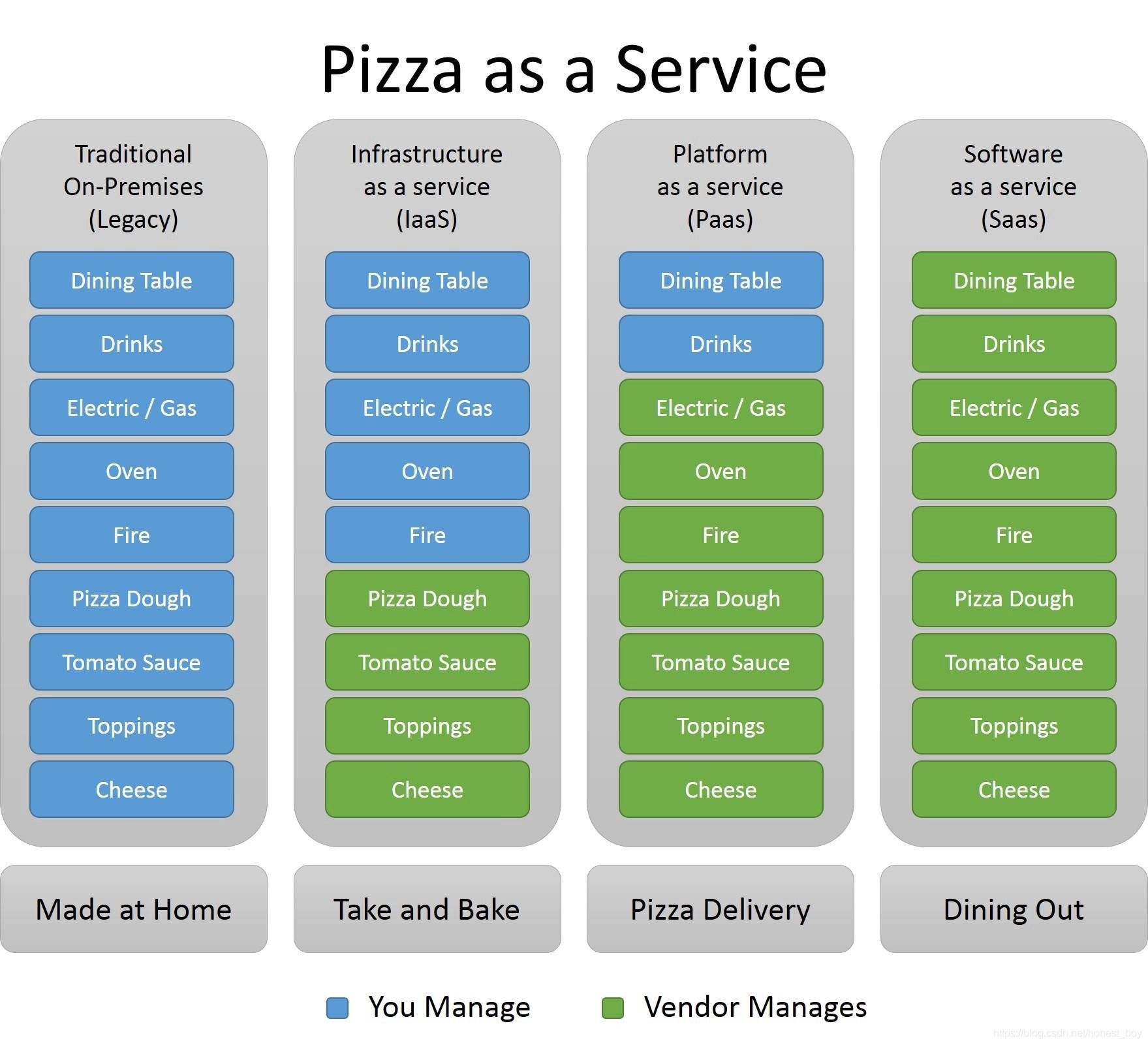 比萨即服务的隐喻是由Albert Barron于2014年首次提出的,用于可视化基础设施即服务(IaaS),平台即服务(PaaS)和软件即服务(SaaS)之间的差异。乍一看,它看起来很棒-但是,如果您深入查看,它就会崩溃。此图说明您需要做的事情越来越少,但是列出的项目和越来越“外包”的项目不适合进行比较。我将在原始图中查看服务,并为希望选择要使用的服务的人提出更好的比较建议。