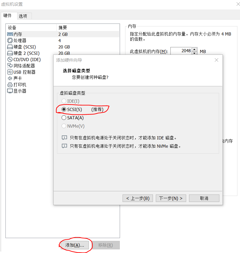 右击虚拟机》设置》添加》硬盘》SCSI