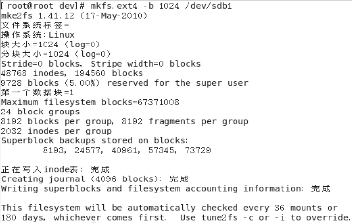 输入mkfs.ext4 -b 1024 /dev/sdb1
