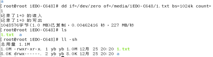 验证:输入dd if=/dev/zero of=/media/1ED(按tab键补全)/1.txt bs=1024k count=1