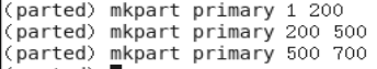 在parted软件中输入 mkpart primary 500 700 将磁盘分出一个200M大小的分区
