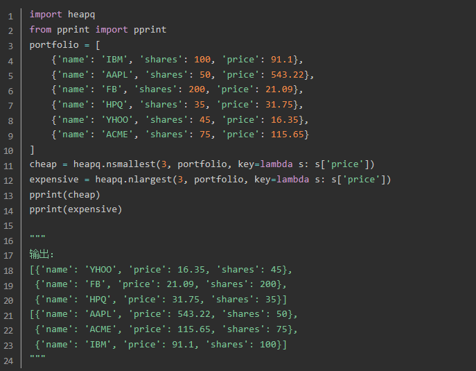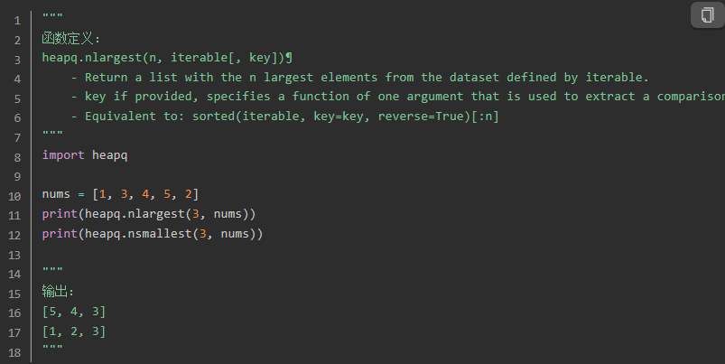 anyway,heapq其实就是对排序功能,因为已经排序了,所以heappop() 就是弹出下标为0,也就是第一个值,其次就是使用nlargest或者nsmallest()找出其中的最大最小值。