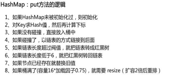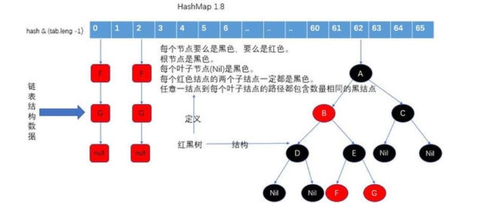 JDK1.8之后,当若桶中链表元素个数大于等于8时,链表转换成树结构;若桶中链表元素个数小于等于6时,树结构还原成链表。因为红黑树的平均查找长度是log(n),长度为8的时候,平均查找长度为3,如果继续使用链表,平均查找长度为8/2=4,这才有转换为树的必要。链表长度如果是小于等于6,6/2=3,虽然速度也很快的,但是转化为树结构和生成树的时间并不会太短。