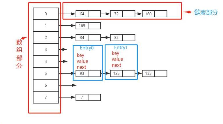 从上图我们可以发现哈希表是由数组+链表组成的,一个长度为16的数组中,每个元素存储的是一个链表的头结点。那么这些元素是按照什么样的规则存储到数组中呢。一般情况是通过hash(key)%len获得,也就是元素的key的哈希值对数组长度取模得到。比如上述哈希表中,12%16=12,28%16=12,108%16=12,140%16=12。所以12、28、108以及140都存储在数组下标为12的位置。HashMap其实也是一个线性的数组实现的,所以可以理解为其存储数据的容器就是一个线性数组。这可能让我们很不解,一个线性的数组怎么实现按键值对来存取数据呢?这里HashMap有做一些处理。首先HashMap里面实现一个静态内部类Entry,其重要的属性有key , value, next,从属性key,value我们就能很明显的看出来Entry就是HashMap键值对实现的一个基础bean,我们上面说到HashMap的基础就是一个线性数组,这个数组就是Entry[],Map里面的内容都保存在Entry[]里面。