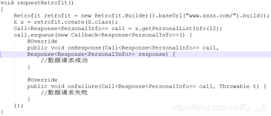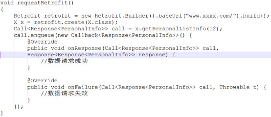首先将域名传入构造一个Retrofit,然后通过retrofit中的create方法传入一个Java接口并得到一个x(当然x这个对象是经过处理了的)调用getPersonalListInfo(12)然后返回一个Call,最后这个Call调用了enqueue方法去异步请求http,这就是一个基本的Retrofit的网络请求。Retrofit2中Call接口的默认实现是OkHttpCall,它默认使用OkHttp3作为底层http请求client。