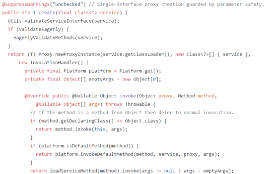 create()方法是个泛型方法,调用它时会返回一个范型T的对象,我们这里类型是X接口,在内部实现上,很明显了使用了动态代理返回了一个X的代理类。当调用X内部方法的时候,会调用invoke方法。invoke方法内则通过内部一系列的封装最后返回一个Call对象。