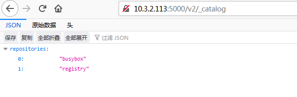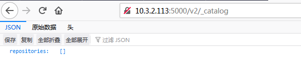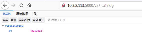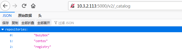 打开本地浏览器,输入10.3.2.113:5000/v2/_catalog,即可打开刚才创建的仓库: