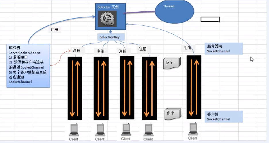 2 对应的SocketChannel注册倒Selector上,一个Selector上可以注册多个SocketChannel