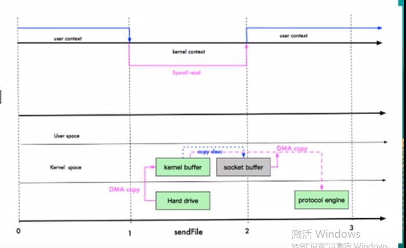 linux2.1版的sendfile中还有一次CPU拷贝:3次拷贝,2次切换