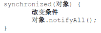在调用wait()之前,线程必须要获得该对象的对象级别锁,即只能在同步方法或同步块中调用wait()方法,进入wait()方法后,当前线程释放锁,在从wait()返回前,线程与其他线程竞争重新获得锁,notifyAll方法一旦该对象锁被释放(notifyAll线程退出调用了notifyAll的synchronized代码块的时候),他们就会去竞争。如果其中一个线程获得了该对象锁,它就会继续往下执行,在它退出synchronized代码块,释放锁后,其他的已经被唤醒的线程将会继续竞争获取该锁,一直进行下去,直到所有被唤醒的线程都执行完毕。