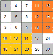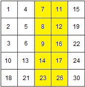 如果不细心也许会掉入一个陷阱中。有人也许认为可以先从行来判定,如果某个数位于某2行间,则只需要检查相应的2列即可,这是错误的。如下左边图所示,假定我们需要查找9是否在矩阵中,由于9位于7到11之间,所以接下来在7和11的这两列中(这2列在图中高亮显示)二分查找9,虽然能够查找到9,虽然查找9成功了,但是这个方法是错误的。因为10也位于7到11之间,但是10并不在这2列中。