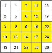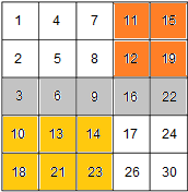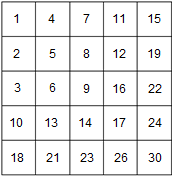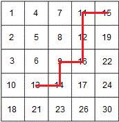 为了便于复杂度分析,我们暂时假定该矩阵为大小n*n。如下图所示为一个杨氏矩阵。
