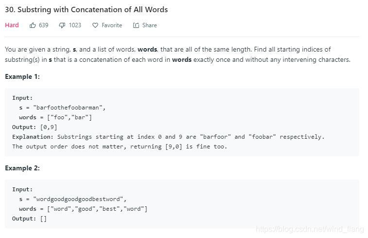 链接的作者提出了,用两个 HashMap 来解决。首先,我们把所有的单词存到 HashMap 里,key 直接存单词,value 存单词出现的个数(因为给出的单词可能会有重复的,所以可能是 1 或 2 或者其他)。然后扫描子串的单词,如果当前扫描的单词在之前的 HashMap 中,就把该单词存到新的 HashMap 中,并判断新的 HashMap 中该单词的 value 是不是大于之前的 HashMap 该单词的 value ,如果大了,就代表该子串不是我们要找的,接着判断下一个子串就可以了。如果不大于,那么我们接着判断下一个单词的情况。子串扫描结束,如果子串的全部单词都符合,那么该子串就是我们找的其中一个。看下具体的例子。
