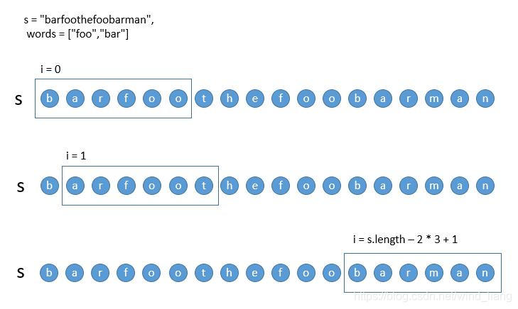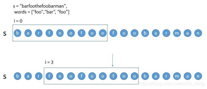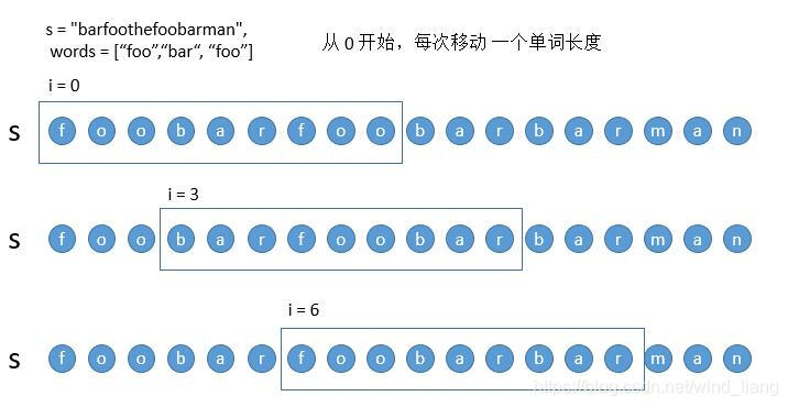 在解法一中,对于 i = 3 的子串,我们肯定是从第一个 foo 开始判断。但其实前两个 foo 都不用判断了 ,因为在判断上一个 i = 0 的子串的时候我们已经判断过了。所以解法一中的 HashMap2 每次并不需要清空从 0 开始,而是可以只移除之前 i = 0 子串的第一个单词 bar 即可,然后直接从箭头所指的 foo 开始就可以了。