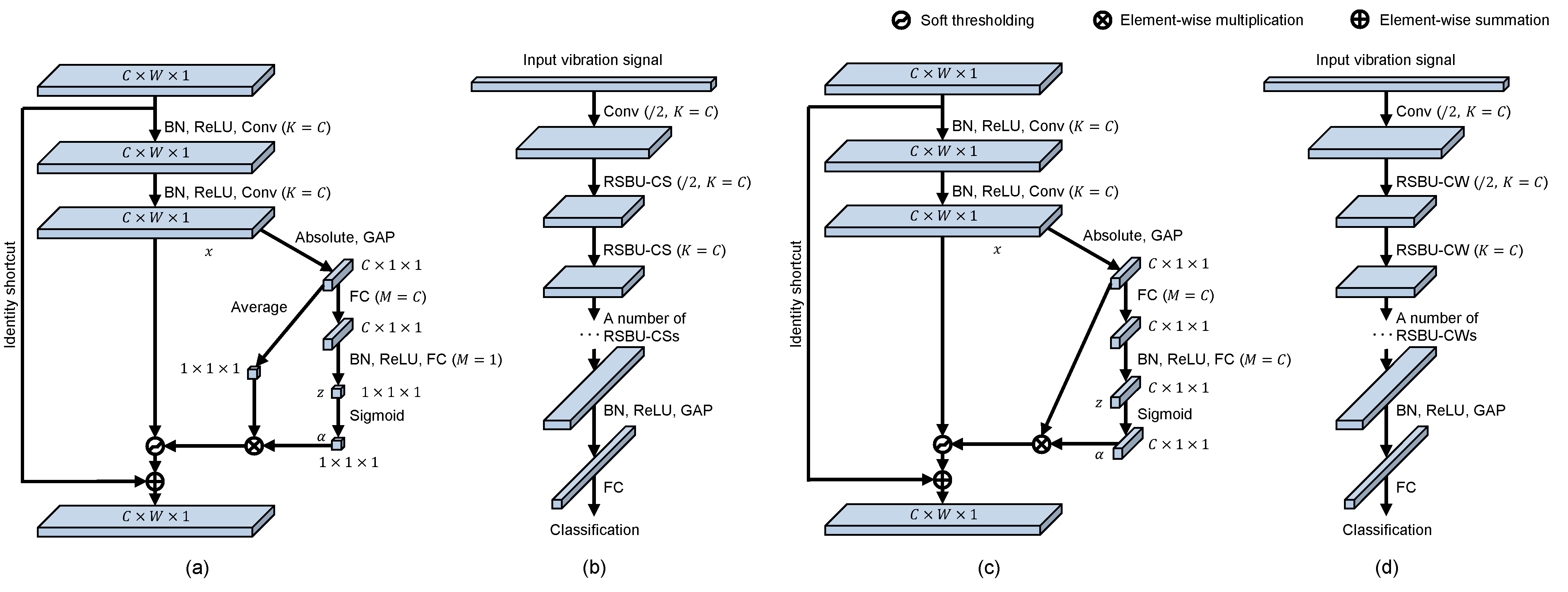在下图中,(a)表示一种改进后的残差模块,名为“残差收缩模块-通道之间共享阈值(Residual Shrinkage Building Unit with Channel-shared thresholds,简称RSBU-CS)”;(b)表示的是DRSN-CS的整体结构示意图;(c)表示另一种改进后的残差模块,名为“残差收缩模块-逐通道不同阈值(Residual Shrinkage Building Unit with Channel-wise thresholds,简称RSBU-CW)”;(d)表示的是DRSN-CW的整体结构示意图。