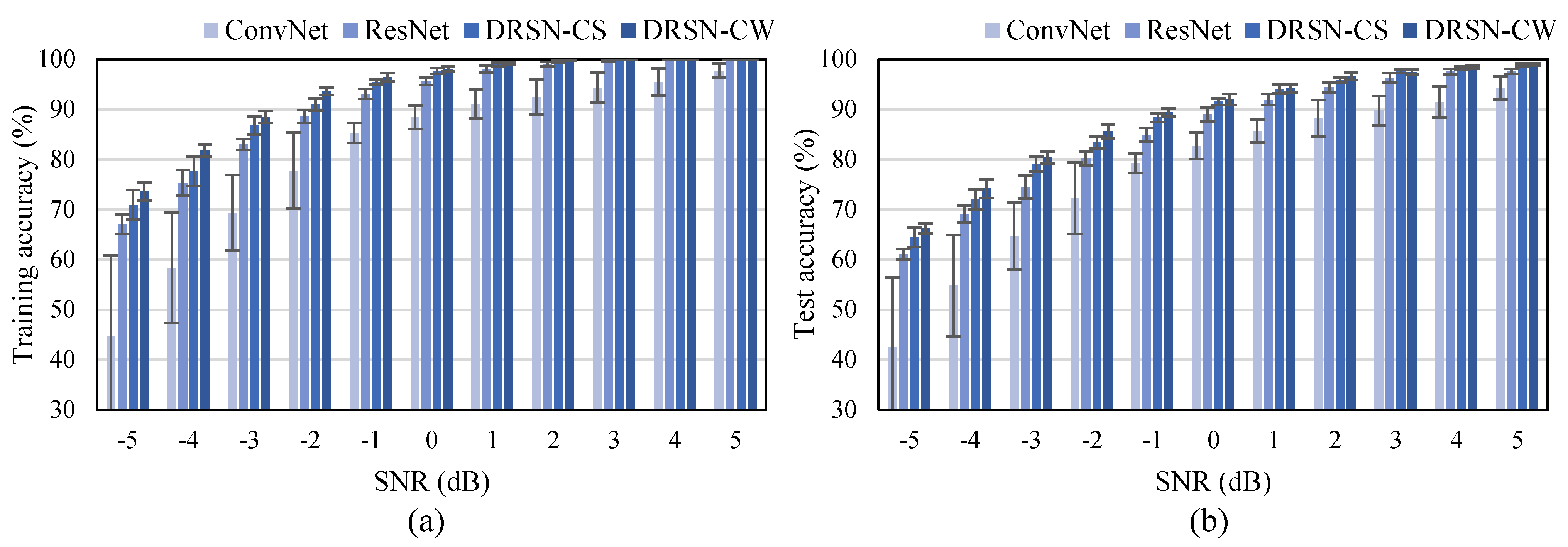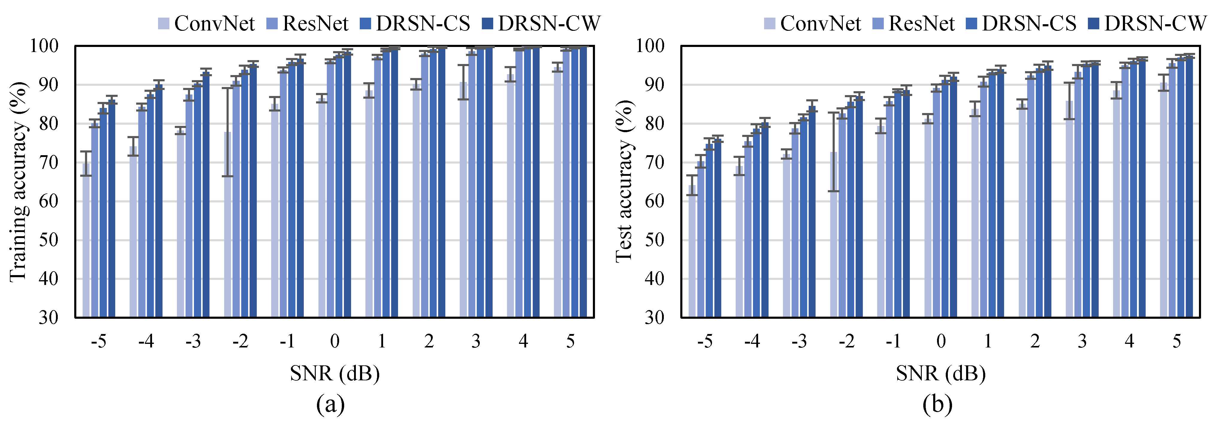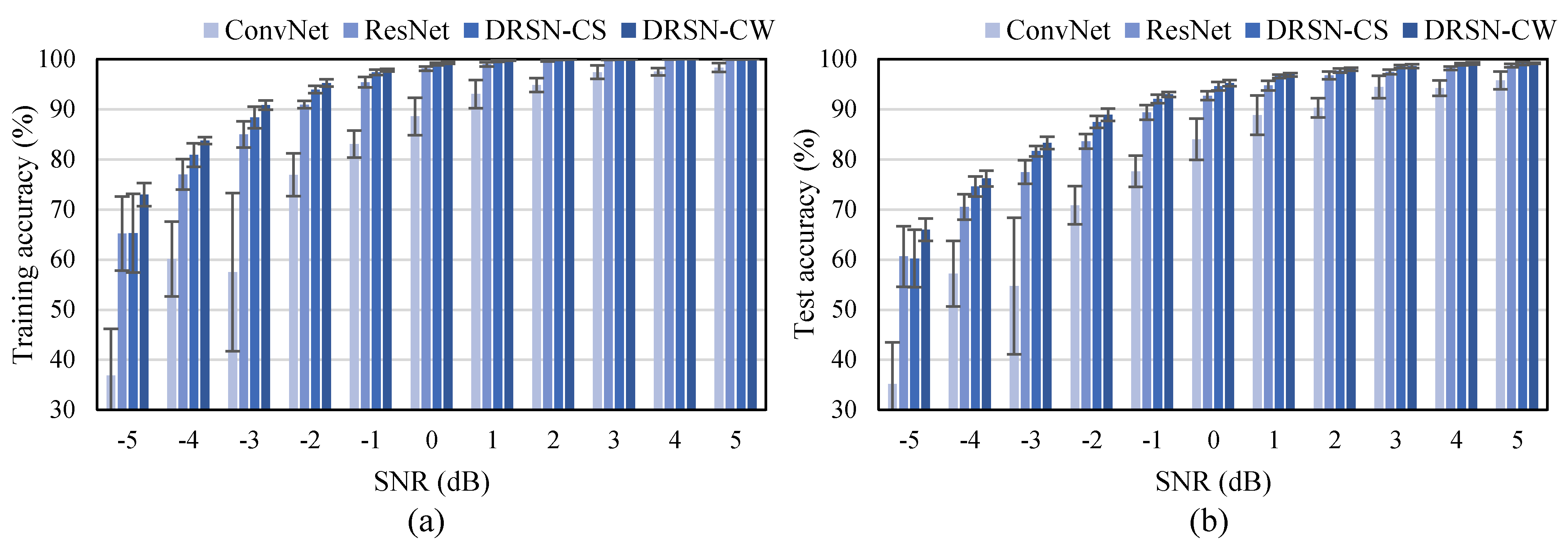 可以看到,在噪声越强的时候,即信噪比(Signal-to-Noise Ratio, SNR)为-5dB的时候,相较于ConvNet和ResNet的效果提升最为明显。在噪声较弱的时候,DRSN-CS和DRSN-CW的准确率也很高,这是因为DRSN-CS和DRSN-CW可以自适应地设置阈值。