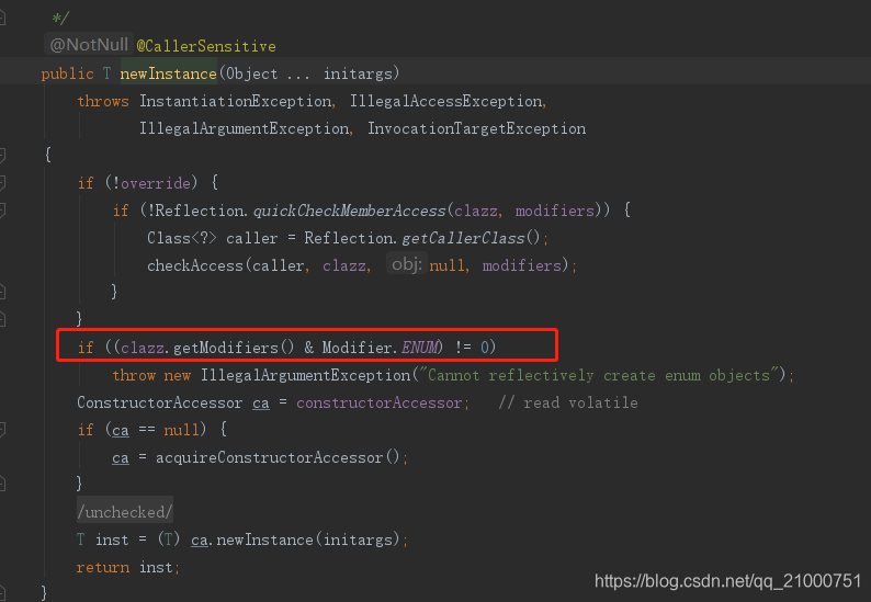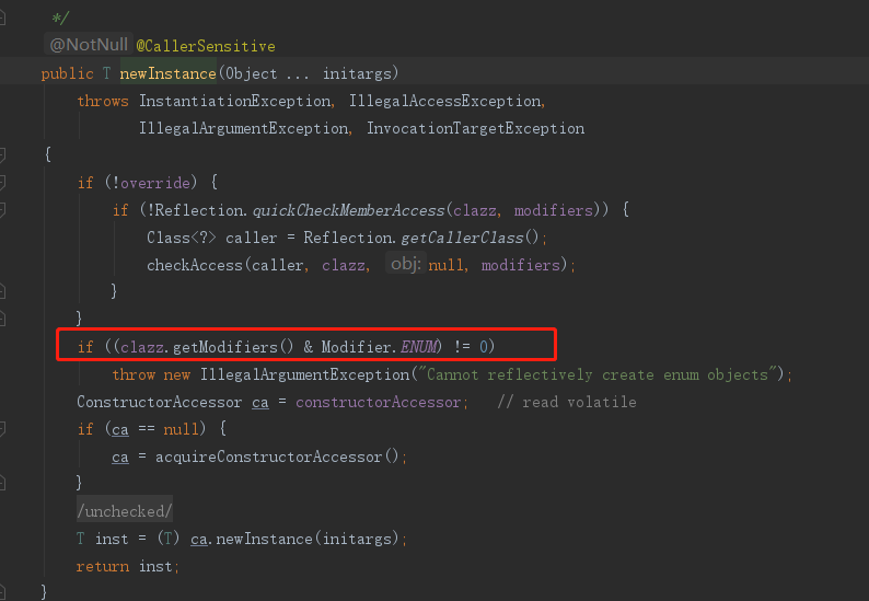 到这里我们也就可以看出枚举序列化和反射都不会重新创建新实例,jvm保证了每个枚举实例变量的唯一性。