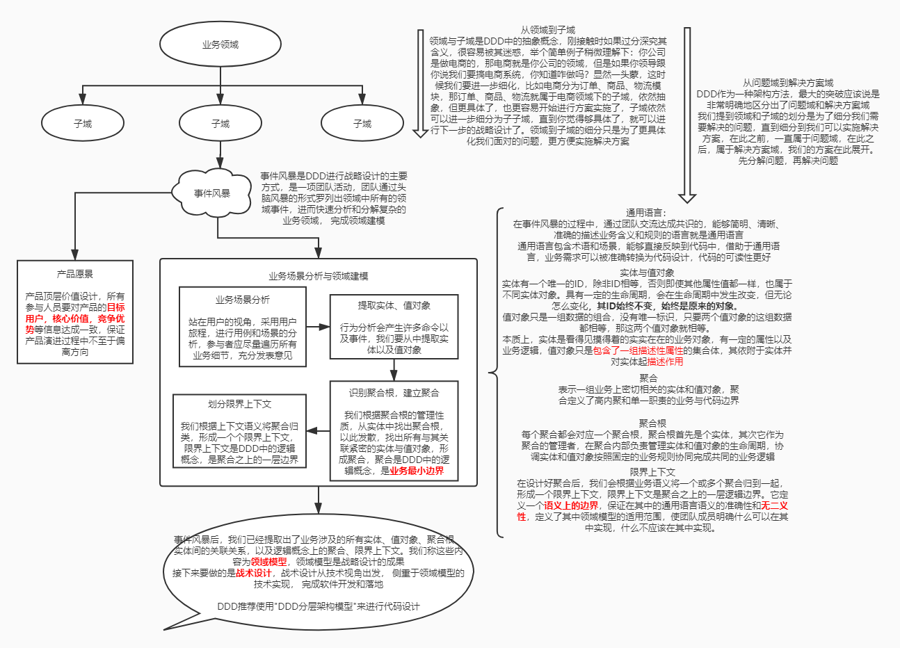 由于DDD的概念比较抽象,建议大家先看左侧的步骤,再看右侧的概念解释,也建议大家在学习DDD时,不要上来就死磕概念,可以先找些DDD落地指导方面的文章,搞明白大致流程后,再来深入概念,会轻松一点