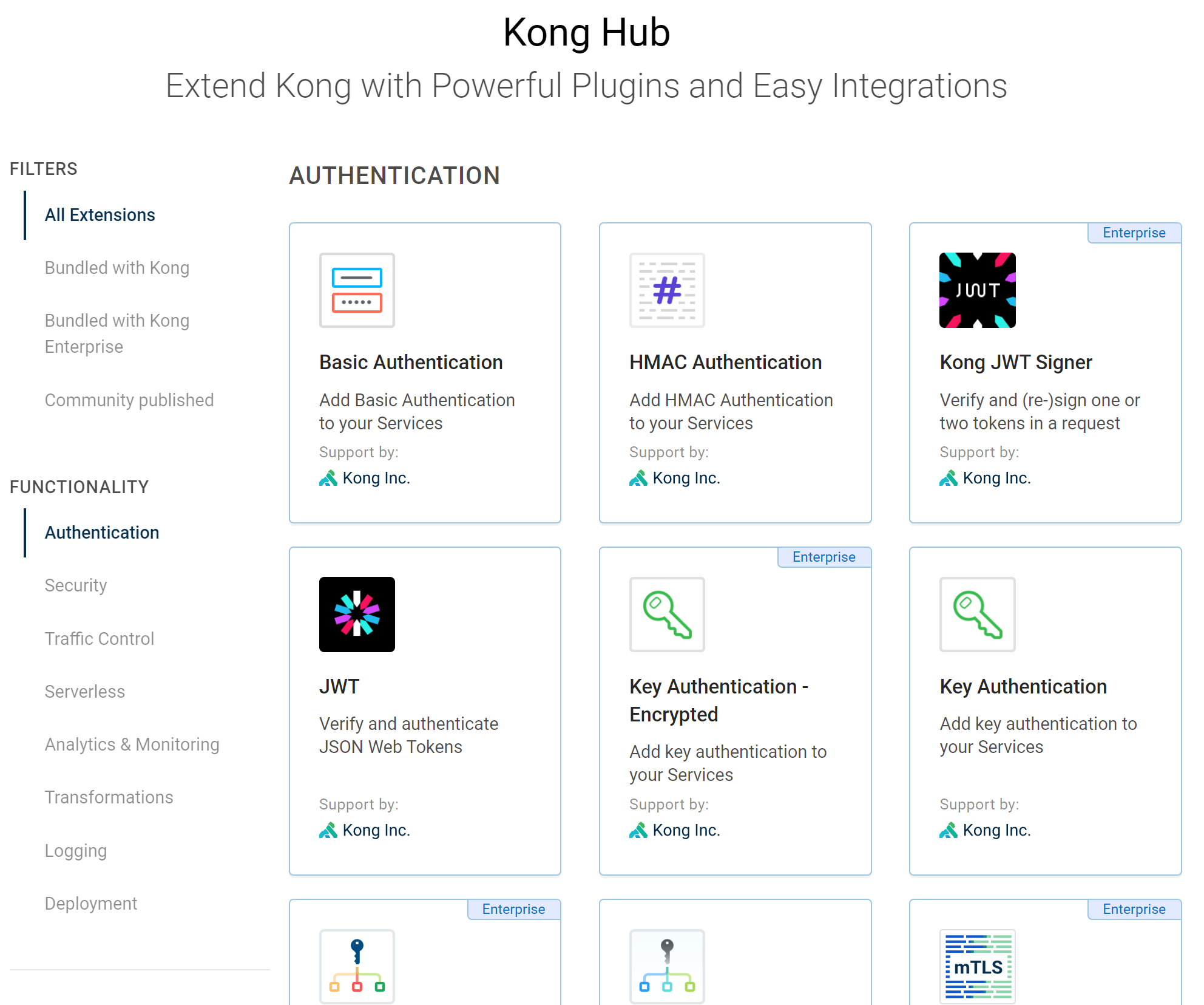 Kong官方预置大量的插件,可以在Kong Hub查看官方插件,其中有三类插件,官方开发的开源插件;第三方开发的开源插件;适用于Kong Enterprise的收费插件。其中官方开发的开源插件有35个。