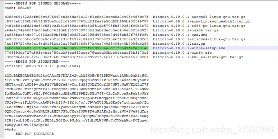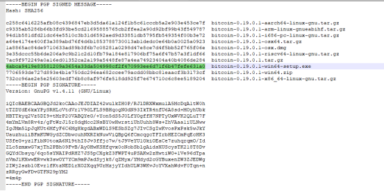打开SHA256SUMS.asc,选中对应版本的前的hash值,如图绿色的,复制。