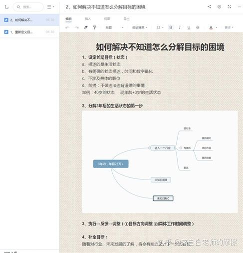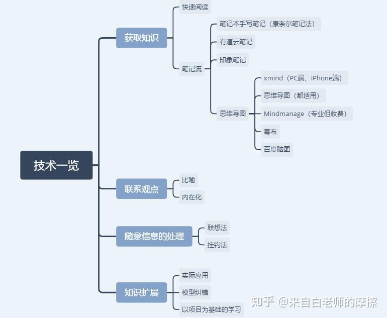 这里就要说一下思维导图。笔记知识是平面的,还算不得体系,也无法指导实践,这时候就需要借助思维导图,构建出知识的逻辑关系,这个过程就是构建知识树,思维导图构建成功,知识也就真正完成了体系化。