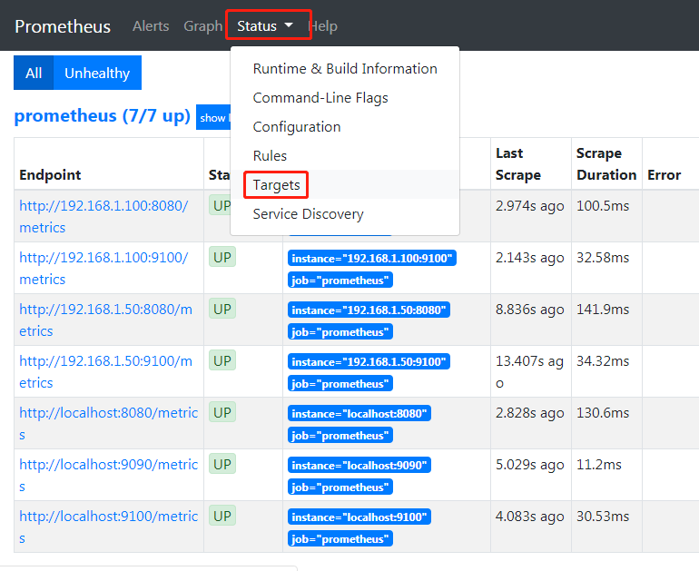 - targets: ['localhost:9090','localhost:8080','localhost:9100','192.168.1.50:8080','192.1 68.1.50:9100','192.168.1.100:8080','192.168.1.100:9100']