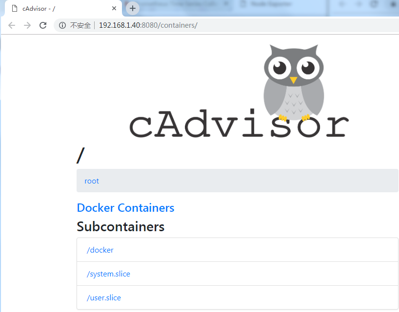 部署安装cadvisor,收集节点容器信息:(在浏览器上验证,猫头鹰头像)