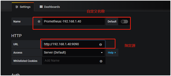 先添加数据源--->添加普罗米修斯源---->进入后更改自定义名称及指定普罗米修斯的源----->点击save上传----->会看到普罗米修斯与grafana连接正常
