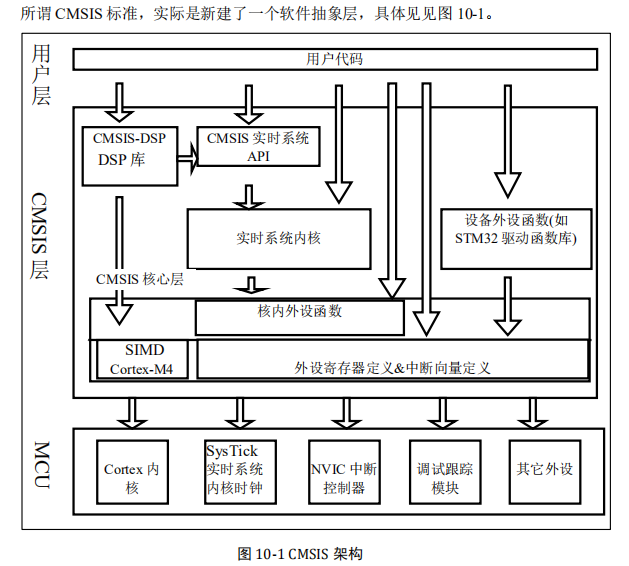 翻译一下就是,ARM 的Cortex芯片的内核相同,但芯片厂商外设可能不同,所以不同芯片厂商开发的微控制器软件可能不兼容。所以ARM和芯片商建立CMSIS。