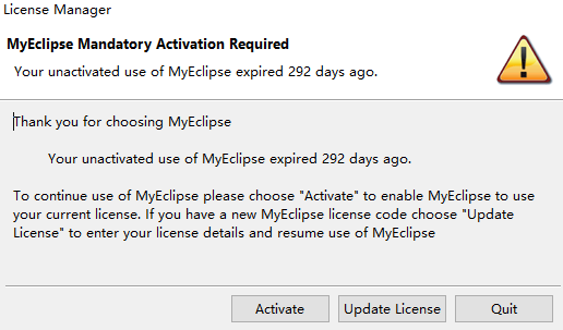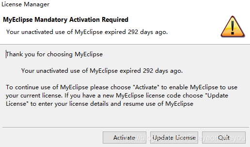 2. 解压完后打开myeclipse,发现它会弹出如下图所示的提示框,这是要你输入验证码,否则只能使用软件292天;