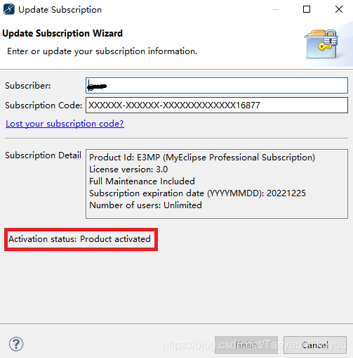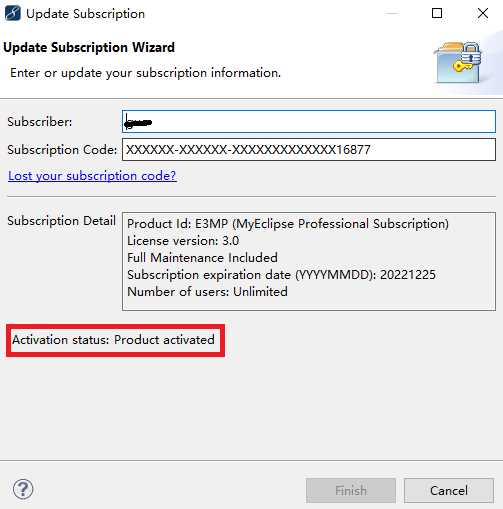 9. 现在我们可以打开Myeclipse验证是否已经激活成功!点击菜单MyEclipse--->Subscription Information,在弹出的提示框看到如下图所示的“激活状态”(Activation status)为“已激活产品”(Productactivated),则表示激活成功了!