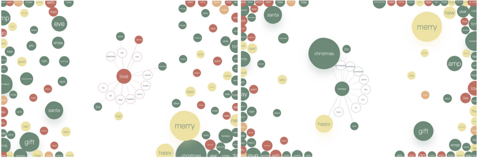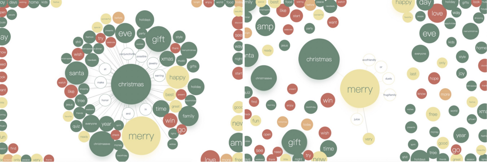 图 4(左)点击 ‘christmas’ 节点查看它的上下文单词。(右)‘merry’ 的上下文单词。