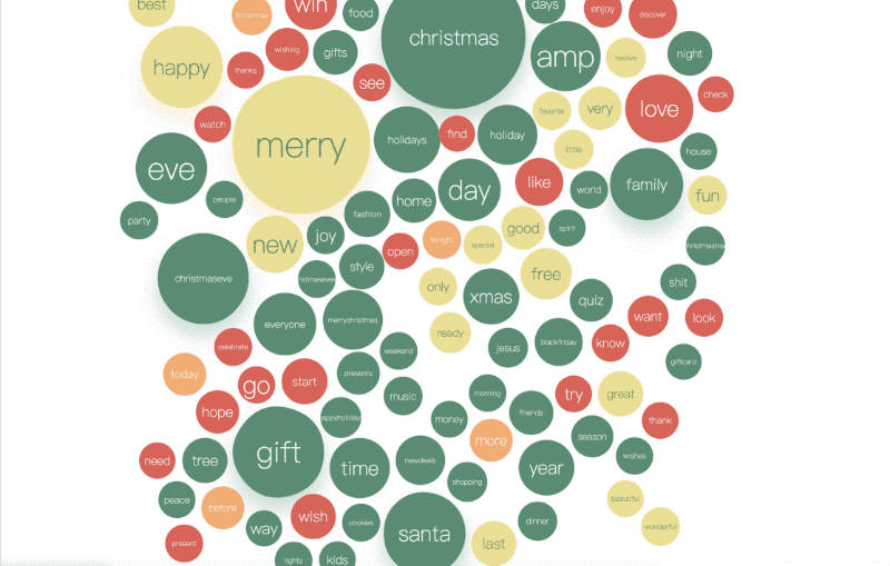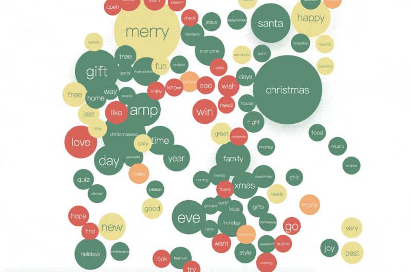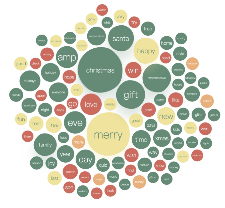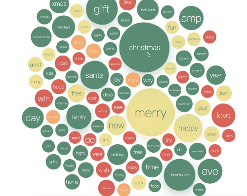 我们从 5w 条于圣诞夜/圣诞节发布的推文中抽取了出现频率最高的 100 个有意义的单词,即去掉了 of、I、you 一类没有实际含义的单词,使用 G6 做了如上一个Q弹的气泡词云图。