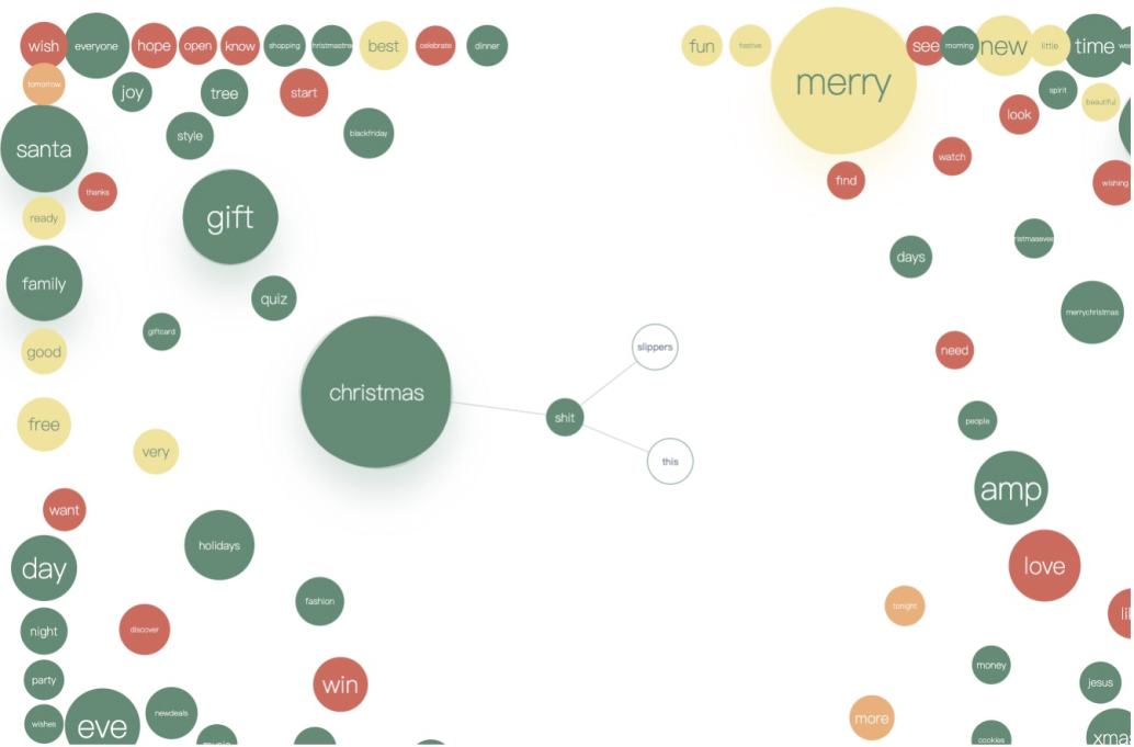 不免俗套,显然 ‘christmas’ 和 ‘merry’ 出现的频率最高,还有类似的词语 ‘xmas’、’christmastree‘ 等。接着是 ‘gift’、‘happy’、‘holiday’、‘santa’ 等节日相关单词。红色节点代表的动词中 ’love‘ 出现的频率最高,看来这个世界还是充满了 love & peace 呢。也有许多人在圣诞节许下了愿望,’hope‘、‘wish’、‘new’、‘best’ 等都在 top 100 单词中。‘quiz’ ? 圣诞节大家在忙考试吗?最神奇的是,top 100 单词中竟然有 ‘shit’?这愈发激发了我们探索这些单词上下文的欲望,所以,点击节点展开看看吧。