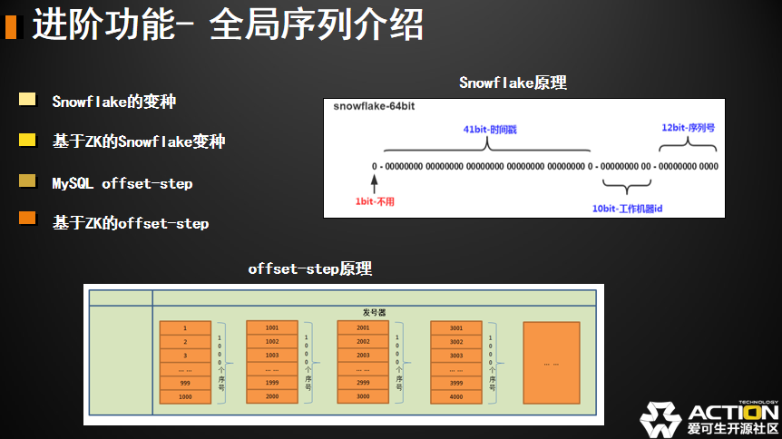 offset-step 好,这是 snowflake 的原理,下面是 offset-step 的原理。它是一个什么概念呢?他是有一个发号器,可以按照步长发号。比如说我这里按照 1000 一个步长发号。当我的 DBLE 需要用到全局序列的话,去这个发号器申请一个步长单位的发号。申请 1000 个号,这 1000 个都归我使用。比如说 DBLE 是个集群,另外一个 DBLE 也来申请这个号的话,通过发号器的并发控制,申请发号的结果一定保证不在同一个区间,这样保证我的序列是唯一的。这个方式其实相对于上一个方式来说,优缺点都很明显。优点是它可以把粒度细到某一张表。比如说我表和表之间的全局序列之间没有关系,我们可以重用数字。snowflake 因为跟时间相关的,所以不能重用。所有的自增序列表用的同一套值。发号器方式可以重用。确定是需要额外一个载体,谁来做这个发号器,用于控制并发和发放号以及持久化。所以我们才会有 MySQL 和 zk 两种模式,其实就是发号器的载体。