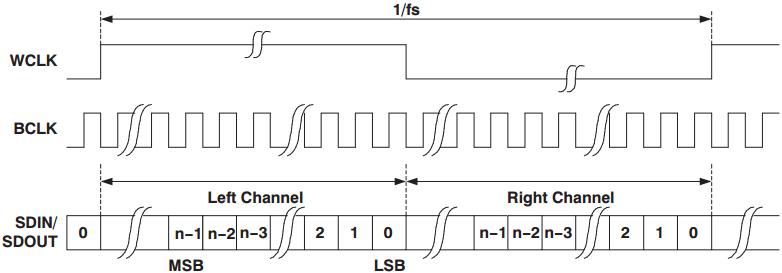 SD是串行数据,在I2S中以二进制补码的形式在数据线上传输。在WS变化后的第一个SCK脉冲,先传输最高位(MSB, Most Significant Bit)。先传送MSB是因为发送设备和接收设备的字长可能不同,当系统字长比数据发送端字长长的时候,数据传输就会出现截断的现象/Truncated,即如果数据接收端接收的数据位比它规定的字长长的话,那么规定字长最低位(LSB: Least Significant Bit)以后的所有位将会被忽略。如果接收的字长比它规定的字长短,那么空余出来的位将会以0填补。通过这种方式可以使音频信号的最高有效位得到传输,从而保证最好的听觉效果。