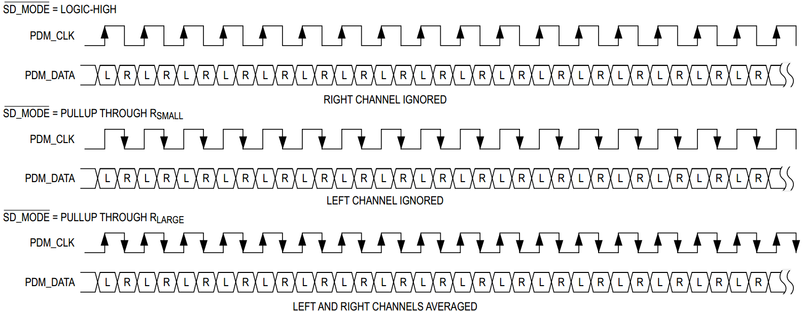 通过PDM接口方式,传输双声道数据只要用到两根信号线。如图21示意两个PDM接口的发送设备与同一个接收设备的连接情况,比如Source 1/2分别作为左右声道的麦克风,通过这种方式可以将采集到的双声道数据传送到接收设备。主设备(此例中作为接收设备)为两个从设备提供时钟,分别在时钟的上升沿和下降沿触发选择Source 1/2作为数据输入。图22为Maxim的Class-D类型功放MAX98358对PDM接口时序的要求,可以看到它在PDM_CLK的上升沿采样左声道数据,在PDM_CLK下降沿采样右声道数据。