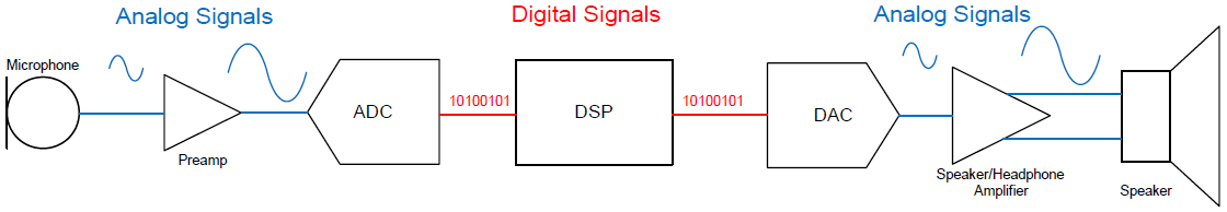 数字音频接口DAI,即Digital Audio Interfaces,顾名思义,DAI表示在板级或板间传输数字音频信号的方式。相比于模拟接口,数字音频接口抗干扰能力更强,硬件设计简单,DAI在音频电路设计中得到越来越广泛的应用。图1和图2对比传统的音频信号和数字音频信号链的区别。