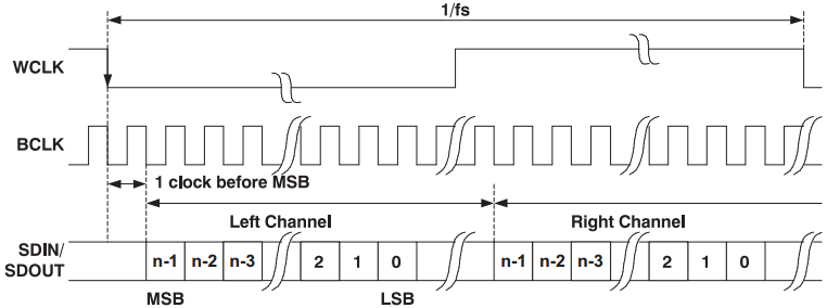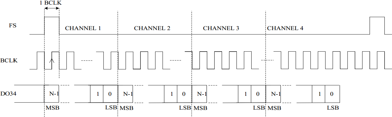 b. 短帧同步,FSYNC脉冲宽度等于1个BCLK周期长度;