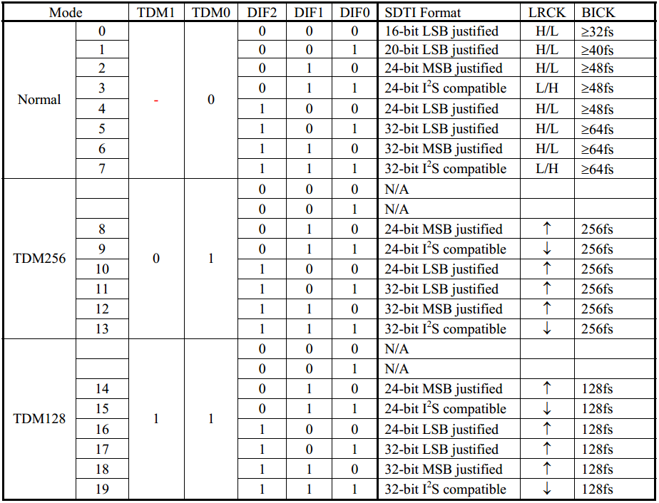 通过寄存器或者管脚电平设置,可以配置CODEC的DAI工作在不同的操作模式。以AKM的24bit 4ch DAC AK4413为例,如表3所示,通过设置TDM[1:0]和DIF[2:0]等5个寄存器的值,可以选择其SDT1接口工作于20种不同模式,在Datasheet中详细说明了每种模式的时序框图。