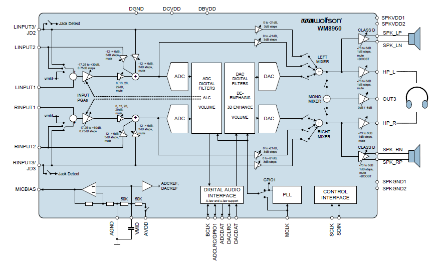 图8 wolfson WM8960 Stereo AUdio CODEC芯片框图