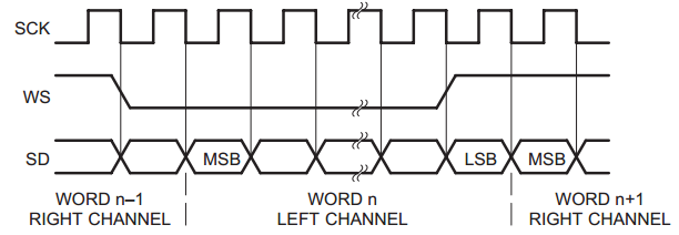 WS也称帧时钟,即LRCLK/Left Right Clock。WS频率等于声音的采样率。WS既可以在SCK的上升沿,也可以在SCK的下降沿变化。从设备在SCK的上升沿采样WS信号。数据信号MSB在WS改变后的第二个时钟(SCK)上升沿有效(即延迟一个SCK),这样可以让从设备有足够的时间以存储当前接收的数据,并准备好接收下一组数据。