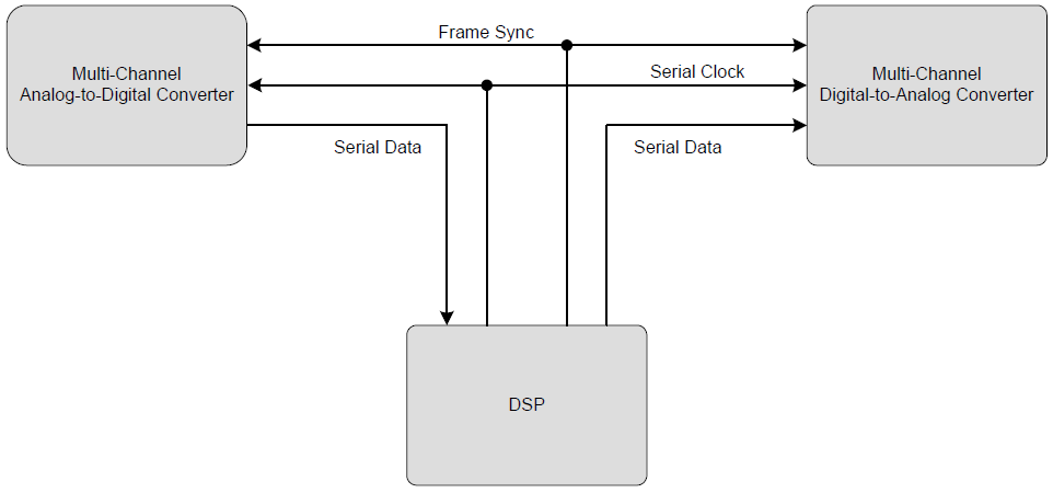 TDM/PCM数字音频接口的硬件拓扑结构也与I2S相近。图12表示应用DSP作为主设备控制ADC和DAC间数字音频流的例子。